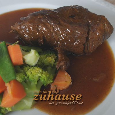Vorsichtig mit Kochlöffel herausnehmen, an einer Ecke aufschneiden und den Inhalt auf den Teller geben.