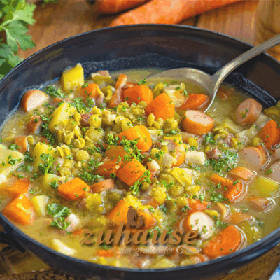 Den geschlossenen Beutel nur in einen Topf mit heißem Wasser legen und leicht köchelnd gut erwärmen lassen.